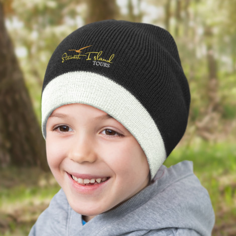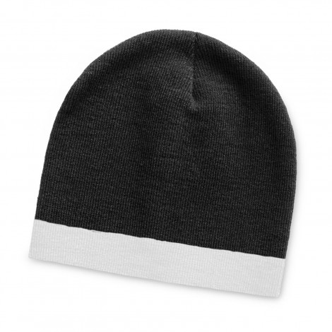 Warm close-fitting beanie knitted from acrylic yarn which has a distinctive stripe around the base. It is available in one size which will fit most people.