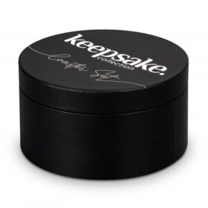 Premium set of six circular Acacia wood coasters with a ceramic holder for storage. The coaster set is presented in a black keepsake branded gift box.