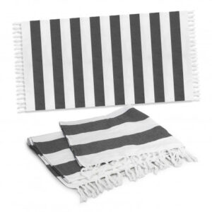 Beach inspired cotton towel manufactured from 200 GSM 100% Cotton. It features a rustic style weave with stripes and a fringed trim.